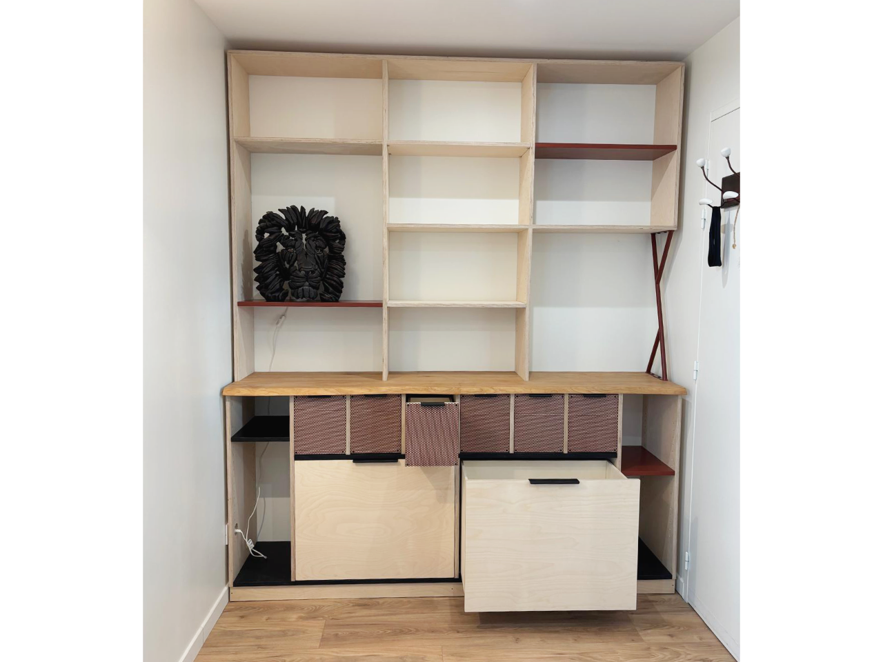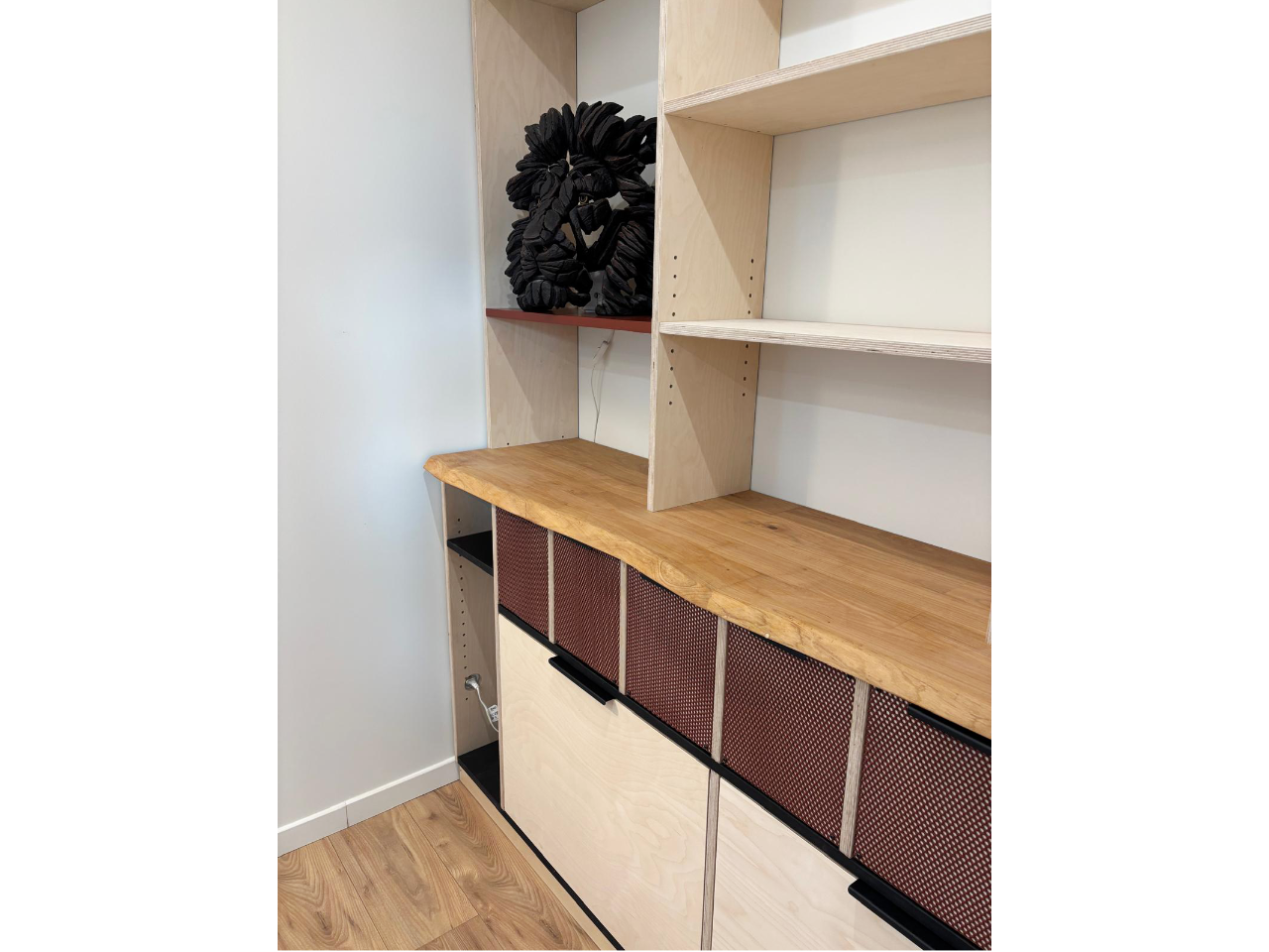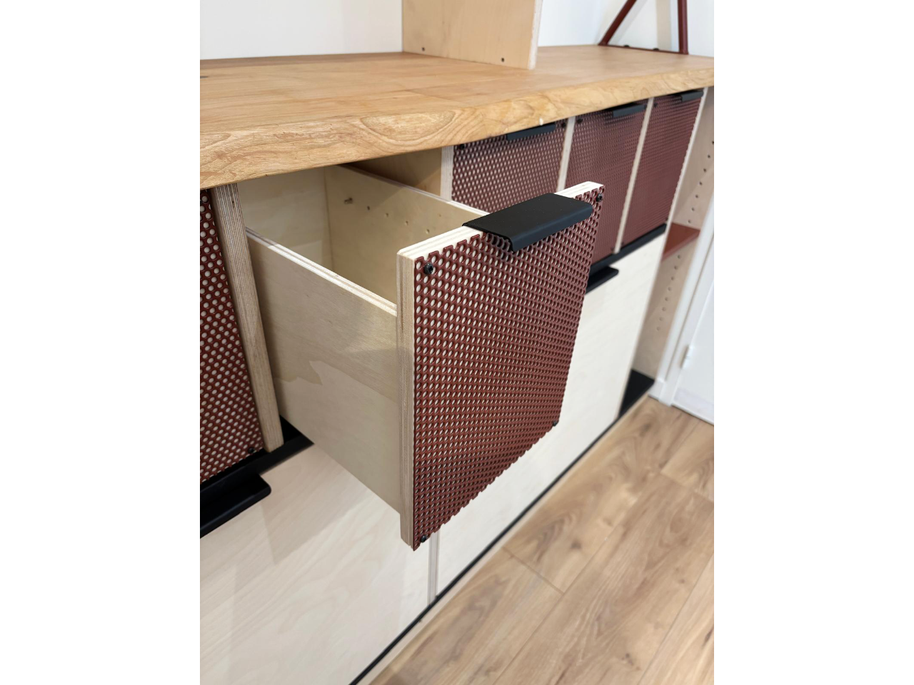 Meuble sur-mesure spécialement créé pour les besoins du praticien : rangement du matériel dans les tiroirs bas, mise en valeur des livres et des objets de décoration en partie haute. Les petits tiroirs avec le métal alvéolé ont été imaginés pour y ranger les fiches patients, avec un faux fond incliné et réglable en profondeur pour caler les fiches toujours vers l’avant des tiroirs.