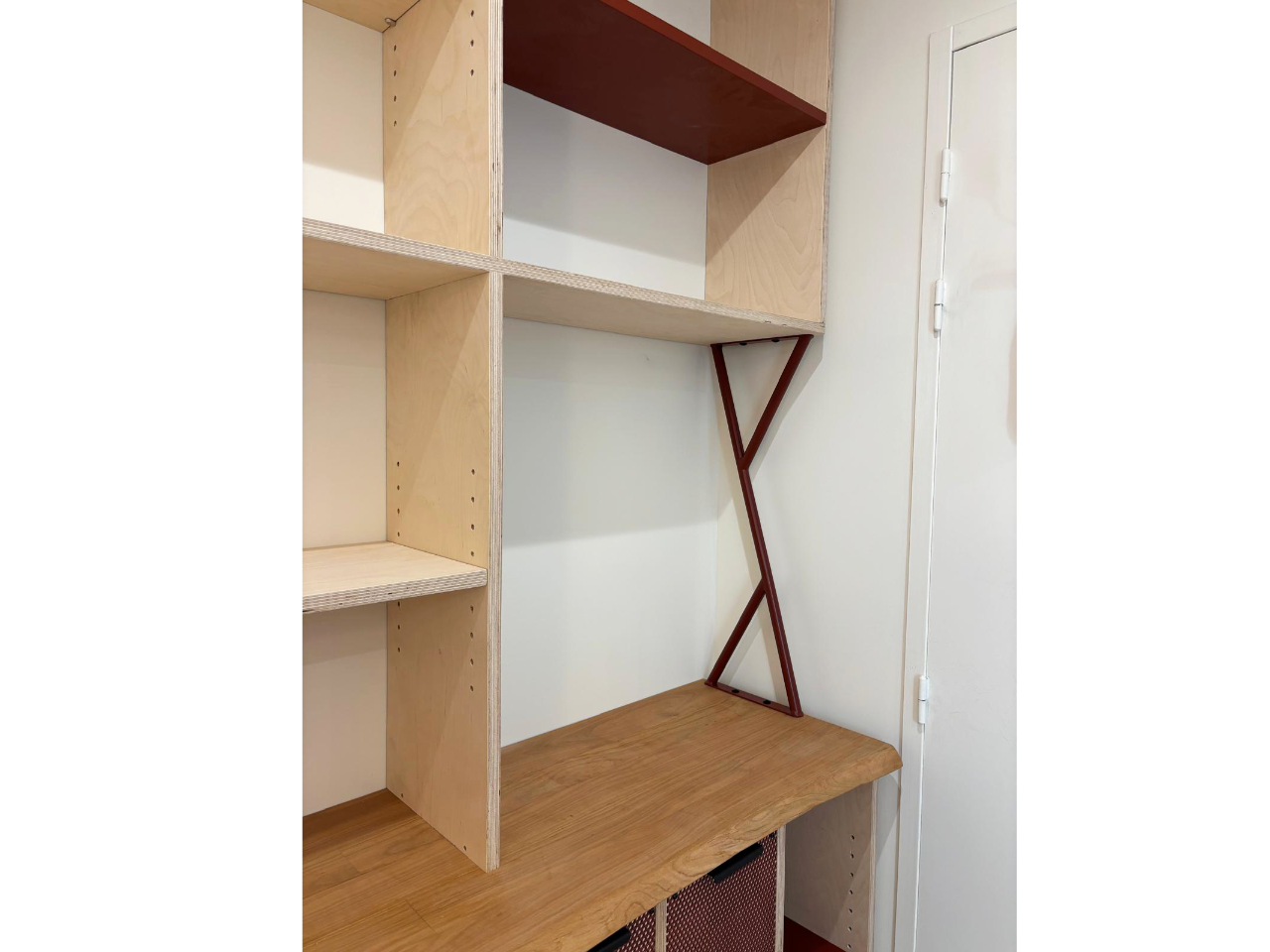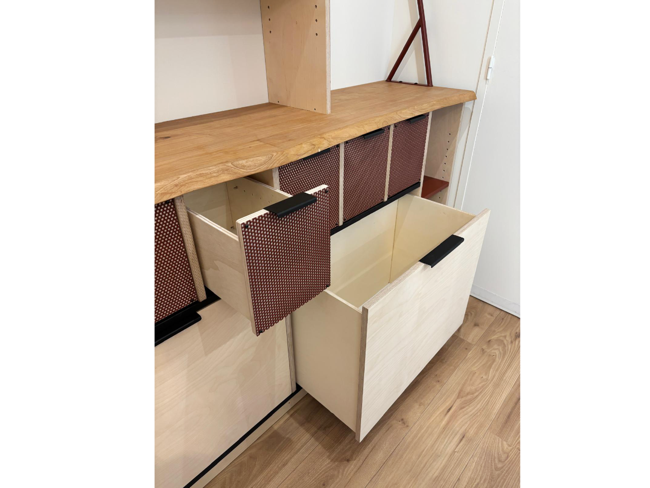Réunion de trois matériaux : contreplaqué bouleau, plateau de merisier et acier thermolaqué rouge basque (qui répond à la teinte rosé du merisier). 60% de matériaux réemployés.