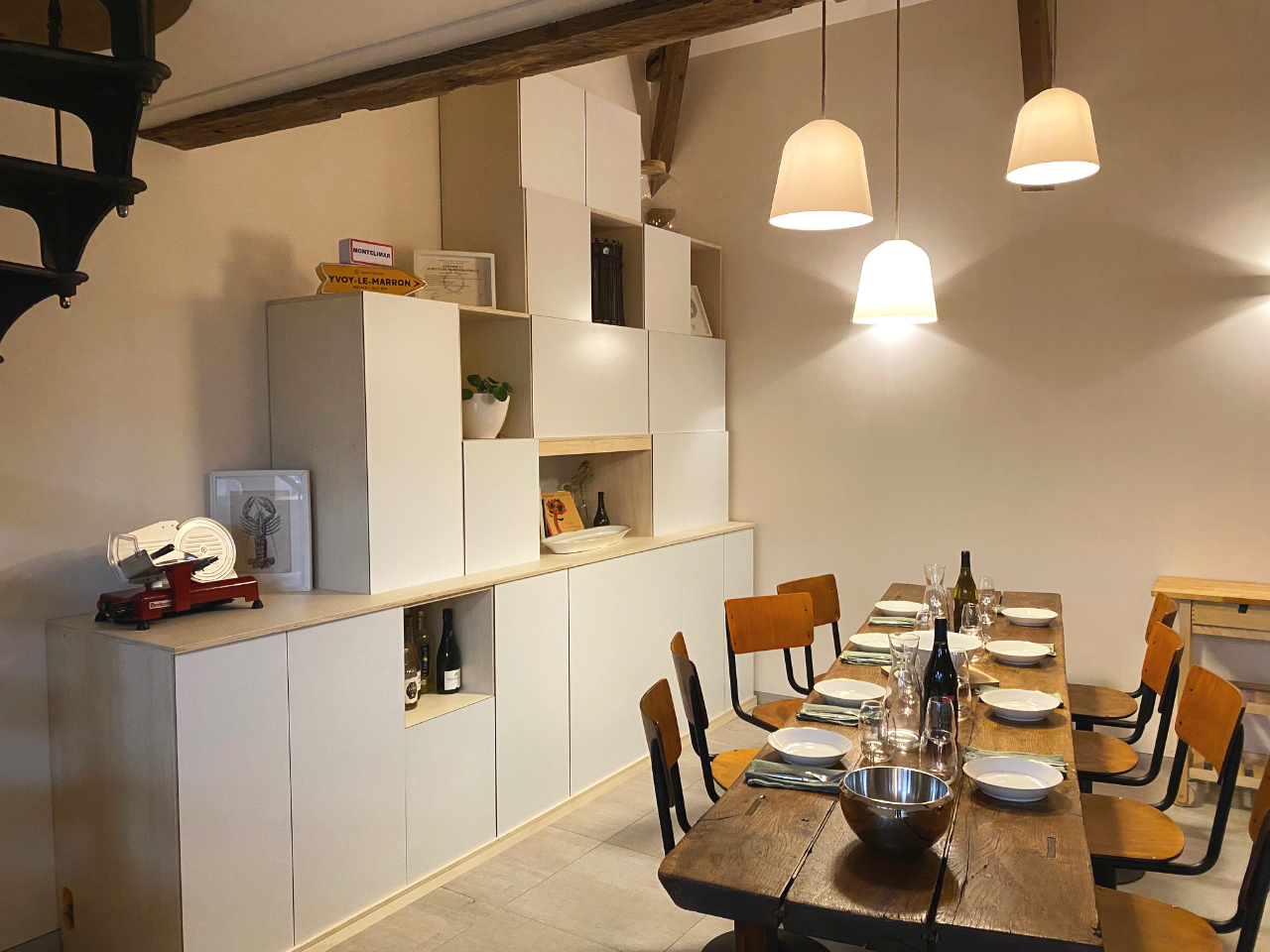 Ce très grand meuble de rangement (3 x 3.5m) a été créé et fabriqué pour le traiteur engagé ABRA .