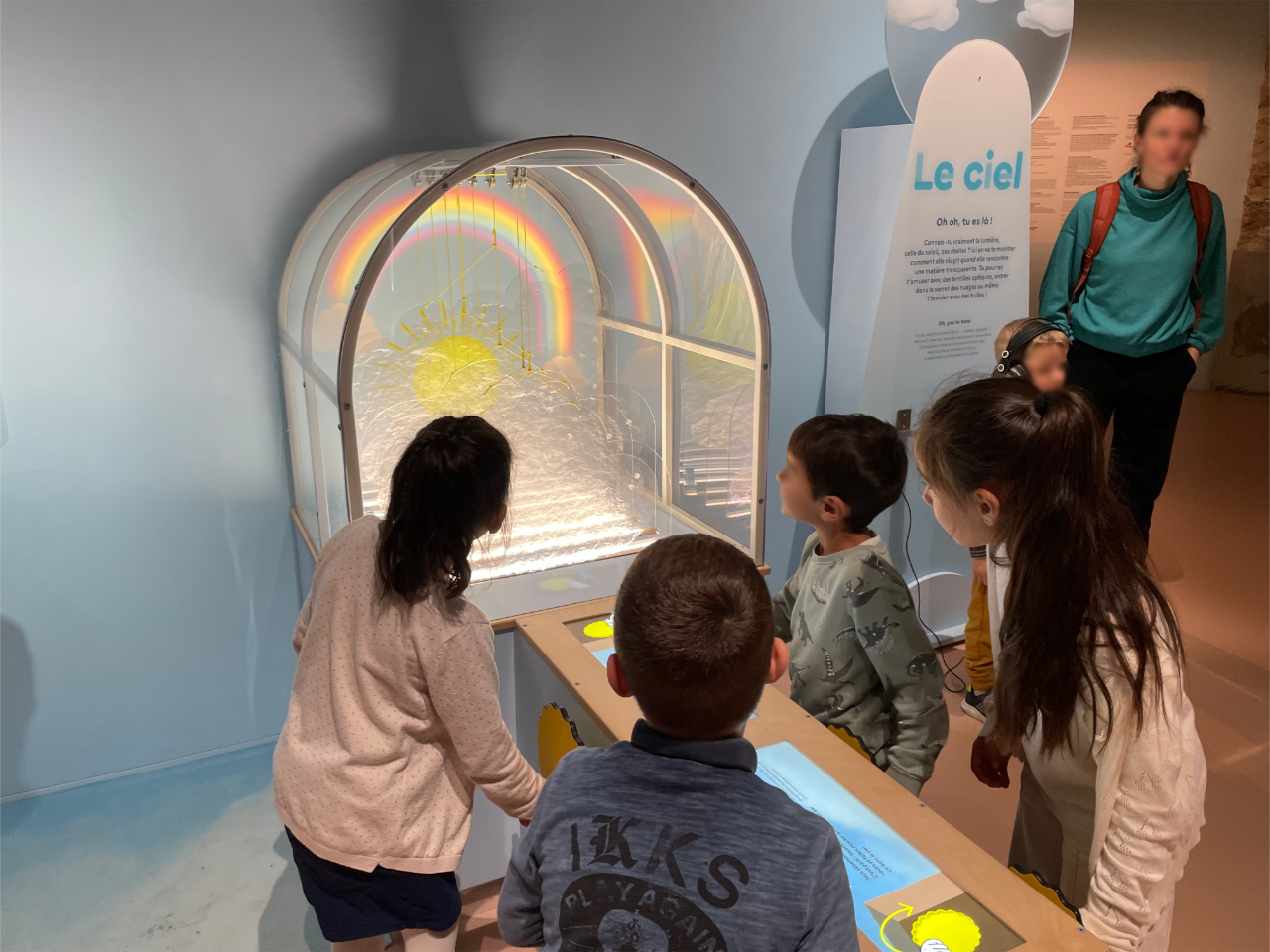 Ce dispositif vous invite à collaborer pour venir masquer progressivement le soleil avec une superposition de nuages constitués de matériaux transparents présentant des reflets. Ainsi, en tournant les manivelles pour faire monter les 5 nuages, les visiteurs découvrent comment la superposition de plusieurs éléments transparents peut finir par former un ensemble opaque, comme c’est la cas pour les nuages. Une surprise vous attend si vous maintenez les 5 nuages en position haute, RDV sur place 😉