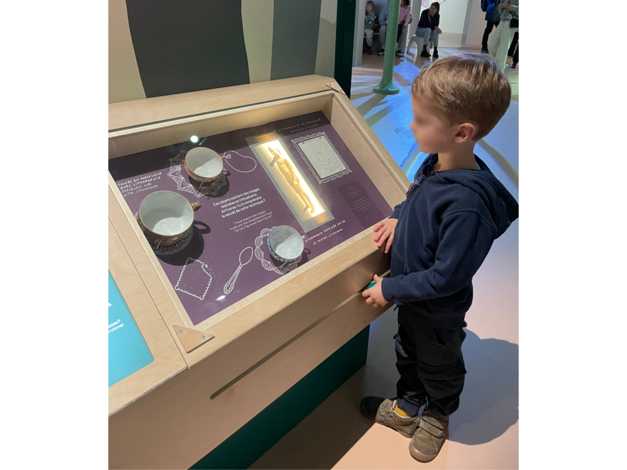 Tel un petit cabinet de curiosité, des objets hétéroclites et inattendus prennent place dans ces vitrines. Les enfants découvrent la subtilité et la finesse d’objets naturels ou artisanaux à travers l’interaction avec la lumière. Tous ces trésors sont scindés en 4 vitrines avec des thématiques différentes : une sur le bois, une sur les différents type de papier, une permet de découvrir la lithophanie sur porcelaine, et une dernière est composée de peaux et coquilles d’êtres vivants. Chaque vitrine nous révèle ses secrets lorsque la lumière passe dessous.