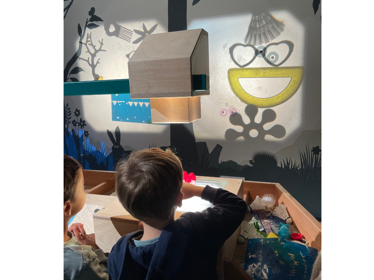2 rétroprojecteurs semblables à ceux qu’il y avait dans les salles de classe autrefois, projettent leur lumière sur le décor : une forêt. A partir d’objets disposés autour, les enfants créent des ombres, des créatures. En jouant sur la superposition (ou non) d’objets divers plus ou moins opaques, translucides ou transparents, l’imaginaire se développe et la forêt prend vie !